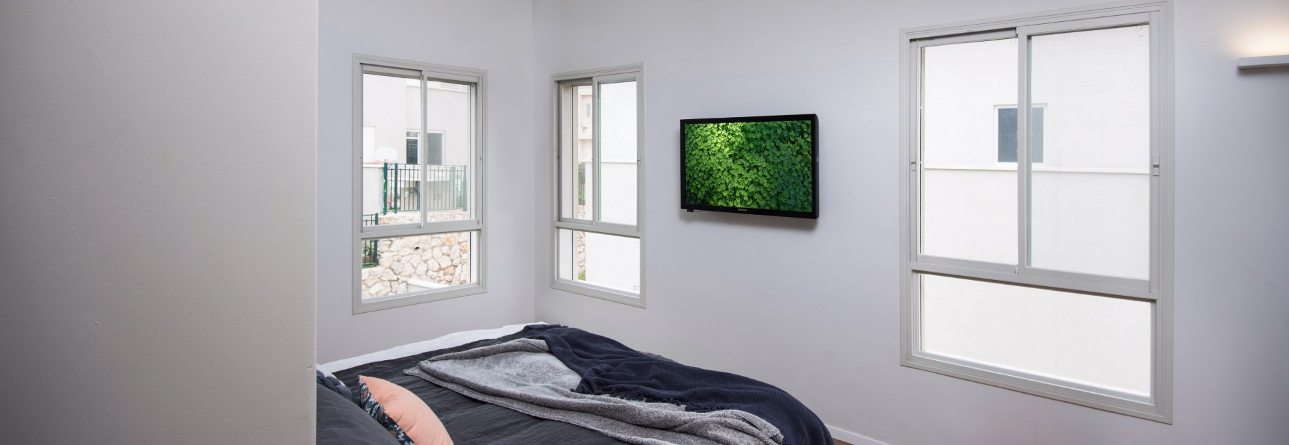 לבית נבחרו מערכות חלונות ודלתות אלומיניום מבית קליל. חלון בלגי לבן בחדרי השינה מתחבר למראה המונוכרומטי ופרופיל אלומיניום בלגי דק, של מערכת חלונות הזזה בלגיים 1700, מאפשרת להינות מהנוף מהחלון ומחיבור לסביבה בצורה אלגנטית ובלי חלוקות וחציצים מיותרים- ממשיכים לשמור על הגבול והאיזון.